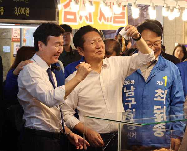 ´õºÒ¾î¹ÎÁÖ´ç Á¤Ã»·¡ ´ëÇ¥°¡ Áö³­ 18ÀÏ ¿ï»ê½Ã ³²±¸ ½ÅÁ¤½ÃÀåÀ» ã¾Æ '¿µÀÔÀÎÀç 1È£' ÀüÅÂÁø º¯È£»ç¿Í ²Ê¹è±â¸¦ ¸Ô°í ÀÖ´Ù.