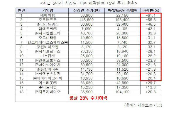 ±è ÀÇ¿øÀº ±âº¸°¡ º¸Áõ¿¬°èÅõÀÚ Á¦µµ¸¦ ÅëÇØ Áß¼Ò±â¾÷À» »óÀå½ÃŲ µÚ »óÀå ´çÀϺÎÅÍ ´ë·® ¸Å°¢ÇÏ´Â µî ÅõÀÚ±Ý È¸¼ö¿¡ ÁýÁßÇÏ¸é¼ ½ÃÀå¿¡ Ãæ°ÝÀ» ÁÖ°í ±â¾÷ÀÇ ¾ÈÁ¤Àû ¼ºÀåÀ» ÀúÇØÇϰí ÀÖ´Ù°í ÁöÀûÇß´Ù. ±âº¸°¡ »óÀåÀÏ¿¡ ¸Å°¢ÇÑ 15°³ »çÀÇ ÁÖ°¡´Â ¸Å°¢¿Ï·á 5ÀÏ ÈÄ »óÀåÀÏ ´ëºñ Æò±Õ 25% Ç϶ôÇß´Ù. (ÁÖ)¿¡ÀÌÅÒÀÇ °æ¿ì »óÀåÀÏ 5¸¸6900¿øÀÌ´ø ÁÖ°¡°¡ ¸Å°¢ ¿Ï·á 5ÀÏ ÈÄ 2¸¸2150¿øÀ¸·Î 61.1% Æø¶ôÇßÀ¸¸ç (ÁÖ)Å©·¡ÇÁÅæµµ 55.8% Ç϶ôÇß´Ù.