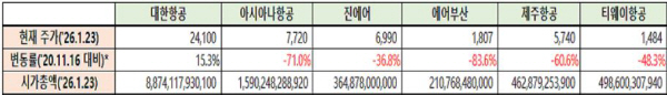 ±¹¹ÎÀÇÈû °û±ÔÅÃ(ºÎ»ê ¼µ¿) ÀÇ¿øÀº 27ÀÏ Á¤ºÎ°¡ Ç×°ø»ç ÅëÇÕÀ» °áÁ¤ÇÑ 2020³â 11¿ù 16Àϰú ¿ÃÇØ 1¿ù 23ÀÏÀÇ ÁÖ°¡¸¦ ¼öÁ¤ÁÖ°¡ ±âÁØÀ¸·Î ºÐ¼®ÇÑ °á°ú, Àμö±â¾÷ÀÎ ´ëÇÑÇ×°ø¸¸ ÁÖ°¡°¡ 15.3% »ó½ÂÇÑ ¹Ý¸é, ÇÇÀμö±â¾÷ÀÎ ¾Æ½Ã¾Æ³ªÇ×°ø°ú ÅëÇÕÀÌ ÃßÁøµÇ´Â LCC ¸ðµÎ ÁÖ°¡°¡ Å©°Ô ¶³¾îÁ³´Ù. ¾Æ½Ã¾Æ³ªÇ×°øÀº 71%, ¿¡¾îºÎ»êÀº 83.6%, Áø¿¡¾î´Â 36.8% Ç϶ôÇÑ °ÍÀ¸·Î ³ªÅ¸³µ´Ù.