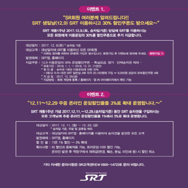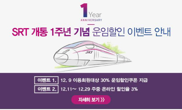 ¿ì¼± SRT °³Åë1Áֳ⠴çÀÏÀÎ 12¿ù 9ÀÏ¿¡ ¿Â÷¸¦ ÀÌ¿ëÇϴ ȸ¿ø ¸ðµÎ¿¡°Ô 30% ¿îÀÓÇÒÀÎÄíÆùÀ» Áö±ÞÇÑ´Ù. ÄíÆùÀ» ¹Þ±â À§Çؼ± SR ȸ¿ø°¡ÀÔ ÈÄ È¨ÆäÀÌÁö¿Í ¾Û¿¡¼ 9ÀÏ SRT ½ÂÂ÷±ÇÀ» ¹ß±ÇÇÏ¸é µÈ´Ù.