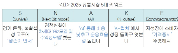 ´ëÇÑ»ó°øÈ¸ÀǼҴ 7ÀÏ ¡®2025 À¯Åë»ê¾÷ ¹é¼¡¯¸¦ ¹ß°£ÇØ ¿ÃÇØ ¼Òºñ½ÃÀå Ű¿öµå·Î ¡®S¡¤N¡¤A¡¤K¡¤E¡¯¸¦ Á¦½ÃÇß´Ù. ´ëÇÑ»óÀÇ´Â ¡°°æ±âħü¿Í ºÒÈ®½Ç¼º °íÁ¶¿¡ »ýÁ¸(Survival) °æÀïÀÌ ´õ¿í Ä¡¿ÇØÁø ¸¸Å À¯Åë±â¾÷Àº Â÷¼¼´ë(Next) ºñÁî´Ï½º ¸ðµ¨°ú ¼öÀÍ ¸ðµ¨À» ã¾Æ¾ß ÇÑ´Ù¡±¸ç ¡°¡®AI¡¯¿Í ¡®K-ÄÃó(K-culture)¡¯¿¡¼ µ¹ÆÄ±¸¸¦ ã°í °¡°Ý Á߽à ¼Òºñ Æ®·»µå(Economical consumption)¿¡µµ Àû±Ø ´ëÀÀÇÒ Çʿ䰡 ÀÖ´Ù¡±°í ¼³¸íÇß´Ù.