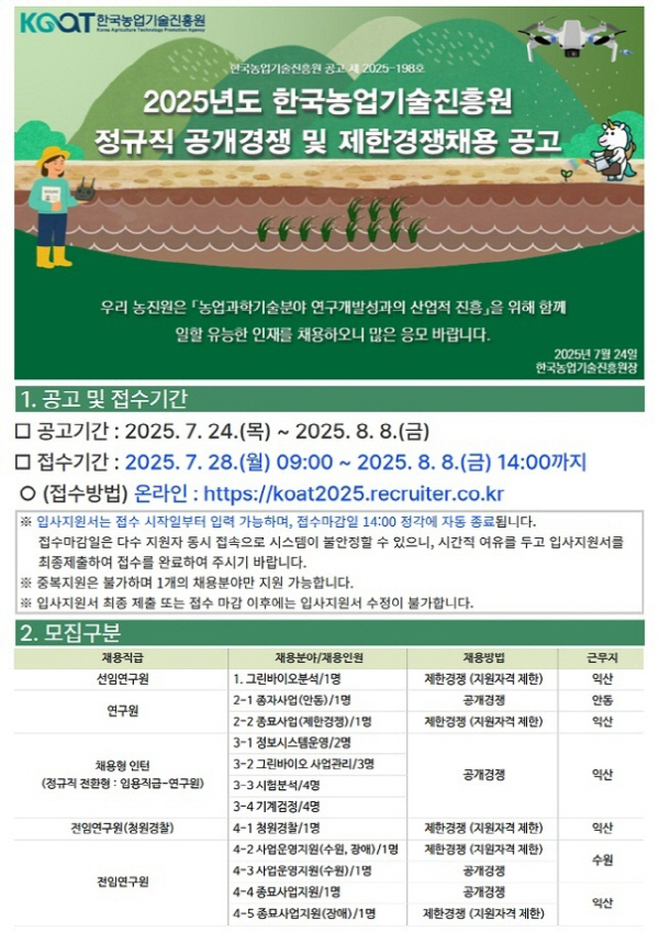 Áö¿ø¼´Â 8ÀÏ ¿ÀÈÄ 2½Ã±îÁö ³óÁø¿ø ä¿ë Àü¿ë ȨÆäÀÌÁö(https://koat2025.recruiter.co.kr/)¸¦ ÅëÇØ ³»¸é µÈ´Ù. ÀÚ¼¼ÇÑ »çÇ×Àº ³óÁø¿ø °ø½Ä ȨÆäÀÌÁö(https//www.koat.or.kr)¿¡¼ È®ÀÎÇÒ ¼ö ÀÖ´Ù.