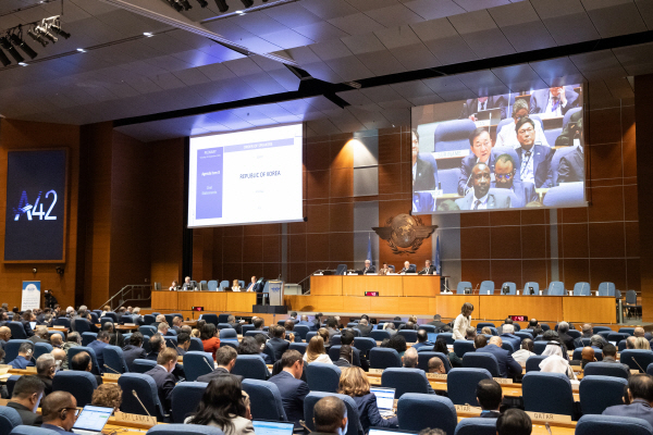 Á¦42Â÷ ±¹Á¦¹Î°£Ç×°ø±â±¸(ICAO) ÃÑȸ¿¡¼ ¿ì¸®³ª¶óÀÇ ±âÁ¶¿¬¼³À» µè°í ÀÖ´Â Âü°¡±¹ ´ëÇ¥µé. ±¹Åä±³ÅëºÎ Á¦°ø