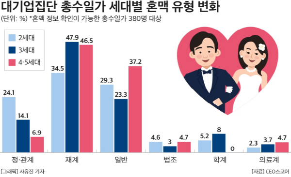 ±¹³» ´ë±â¾÷ ¿À³Ê Àϰ¡ÀÇ È¥ÀÎ °ü°è¸¦ ºÐ¼®ÇÑ °á°ú, °ú°Å¿¡´Â Á¤¡¤°ü°è¿Í »çµ·À» ¸Î´Â ¡®Á¤·«°áÈ¥¡¯ÀÌ ¸¹¾ÒÀ¸³ª ÃÖ±Ù¿¡´Â Àç°è ¹× ÀϹÝÀΰú È¥¸ÆÀ» ÀÕ´Â °æ¿ì°¡ ´õ ¸¹Àº °ÍÀ¸·Î ³ªÅ¸³µ´Ù. ´ë±â¾÷ ÃѼö Àϰ¡ÀÇ È¥¸ÆÀÌ »ç¾÷À» È®ÀåÇϴµ¥ ÇÊ¿äÇÑ ¿¬°á°í¸®¸¦ ¸¸µå´Â ¼ö´Ü¿¡¼ ¹þ¾î³ª, ¼·Î¸¦ Àß ÀÌÇØÇÏ´Â ±â¾÷À̳ª °³ÀÎÀÇ ¼±ÅÃÀ» Á¸ÁßÇÏ´Â ¹æÇâÀ¸·Î º¯ÈÇÑ °ÍÀÌ´Ù.