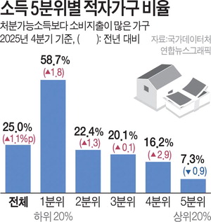ÀûÀÚ°¡±¸ ºñÀ²Àº ÀϹÝÀûÀ¸·Î ¼ÒµæºÐÀ§°¡ ³·À»¼ö·Ï ³ô´Ù. Áö³­ÇØ 4ºÐ±â ¼Òµæ ÇÏÀ§ 20%(1ºÐÀ§) °¡±¸ Áß ÀûÀÚ°¡±¸ ºñÀ²Àº 58.7%·Î 1³â Àü µ¿±âº¸´Ù 1.8%Æ÷ÀÎÆ® ¿Ã¶ú´Ù. 2³â ¿¬¼Ó »ó½Â¼¼´Ù. ¼Òµæ 2ºÐÀ§ °¡±¸ÀÇ ÀûÀÚ°¡±¸ ºñÀ²µµ 22.4%·Î 1.3%Æ÷ÀÎÆ® ³ô¾ÆÁ³´Ù. ¹Ý¸é ¼Òµæ »óÀ§ 20%ÀÎ 5ºÐÀ§ °¡±¸´Â 7.3%·Î 2024³â 4ºÐ±âº¸´Ù 0.9%Æ÷ÀÎÆ® ³·¾ÆÁ³´Ù.