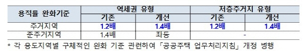 Á¤ºÎ´Â 6ÀÏ Ã»¿Í´ë¿¡¼­ ¿­¸° ±¹¹«È¸ÀÇ¿¡¼­ ÀÌ °°Àº ³»¿ëÀ» ´ãÀº ¡®°ø°øÁÖÅÃÆ¯º°¹ý ½ÃÇà·É¡¯ °³Á¤¾ÈÀ» ÀǰáÇß´Ù. ÀÌ¿¡ µû¶ó ±âÁ¸¿¡´Â ÁØÁÖ°ÅÁö¿ª¿¡¼­¸¸ ¿ëÀû·üÀ» ¹ýÀû »óÇÑÀÇ 1.4¹è±îÁö ¿Ã¸± ¼ö ÀÖ¾úÀ¸³ª ÀÌÁ¦´Â ¿ª¼¼±Ç ³» ÀϹÝÁÖ°ÅÁö¿ª°ú ÀúÃþ ÁÖ°ÅÁö·Î È®´ëµÈ´Ù. ¶Ç Ư·Ê´Â 3³â Çѽ÷ΠµµÀÔÇϵÇ, Ư·Ê Àû¿ë ±â°£ ¿¹Á¤Áö±¸·Î ÁöÁ¤µÈ »ç¾÷¿¡´Â 3³âÀÌ Áö³ªµµ ÀÌ·± ±ÔÁ¤ÀÌ Áö¼ÓµÈ´Ù. ¾Æ¿ï·¯ µµ½Éº¹ÇÕ»ç¾÷¿¡¼­ °ø¿ø¡¤³ìÁö¸¦ Àǹ«ÀûÀ¸·Î È®º¸ÇØ¾ß ÇÏ´Â »ç¾÷ ¸éÀû ±âÁØÀº ±âÁ¸ 5¸¸ §³ À̻󿡼­ 10¸¸ §³ ÀÌ»óÀ¸·Î »óÇâ, »ç¾÷¼ºÀ» ³ôÀδÙ.