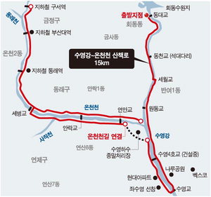 ¼ö¿µ° »êÃ¥·ÎÀÇ ²÷¾îÁø ±¸°£À» '½Ã°¡Àü'(½Ã³»·Î µé¾î¿Í °È´Â ±æ)ÇÏµí µ¹ÆÄÇÏ°í ¿Âõõ »êÃ¥·Î·Î ÇâÇÑ´Ù. µ¿·¡¿ªÀ» Áß½ÉÀ¸·Î À§·Î ±¸¼µ¿¿ª±îÁö 7§°, ¾Æ·¡·Î ¼ö¿µ° ÇÕ·ù ÁöÁ¡±îÁö 3.5§°°¡ À̾îÁø´Ù. ÇÑÂÊÀ¸·Î¸¸ °¡µµ ¾à 10§°, 2~3½Ã°£À» °ÉÀ» ¼ö ÀÖ´Ù. Èë±æ ´ë½Å ½Ã¸àÆ® Æ÷ÀåÀÌ ´ëºÎºÐÀÌÁö¸¸, ¿ì·¹Åº ¸øÁö¾Ê°Ô ºÎµå·´´Ù. ¿îµ¿±â±¸³ª ÆíÀǽü³ÀÌ Àß °®ÃçÁ® ÀÖ°í, Á¢±Ù¼ºÀÌ ÁÁ¾Æ ¾ðÁ¦, ¾î´À ¶§, ¾îµð¼°Ç ã¾Æ°¡ °ÉÀ» ¼ö ÀÖ´Ù. ÁÖ¸»¿¡´Â 1¸¸~2¸¸ ¿©¸íÀÌ ÇѲ¨¹ø¿¡ ã¾Æ 'üÁõ'ÀÌ ºú¾îÁö±âµµ ÇÑ´Ù.