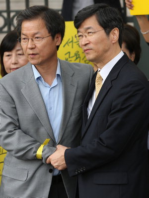 | ´ë¹ý¿ø¿¡¼ ¡¿ª 1³âÇüÀÌ È®Á¤µÅ ±³À°°¨Á÷À» »ó½ÇÇÑ °û³ëÇö(¿À¸¥ÂÊ) Àü ¼¿ï½Ã±³À°°¨ÀÌ 28ÀÏ ¿ÀÈÄ ¼¿ï ¼Ãʵ¿ ¼¿ïÁß¾ÓÁö°Ë ¾Õ¿¡¼ õÁ¤¹è Àü ¹ý¹«ºÎ Àå°üÀÇ ¼ÕÀ» ºÙÀâ°í ÀÖ´Ù. °û Àü ±³À°°¨Àº À̳¯ ¿ÀÈÄ ±¸Ä¡¼Ò¿¡ ¼ö°¨µÆ´Ù. ¿¬ÇÕ´º½º |
