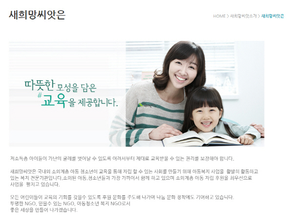 »õÈñ¸Á¾¾¾ÑÀº ÀڽŵéÀÇ È¨ÆäÀÌÁö¸¦ ÅëÇØ ¡®±¹³»¿Ü ¼Ò¿Ü°èÃþ ¾Æµ¿ û¼Ò³âÀÌ ±³À°À» ÅëÇØ ÀÚ¸³ÇÒ ¼ö ÀÖ´Â »çȸ¸¦ ¸¸µé±â À§ÇØ ¾Æµ¿º¹Áö »ç¾÷À» ¹úÀ̰í ÀÖ´Â º¹Áö Àü¹®±â°ü¡¯À̶ó°í ¼Ò°³Çϰí ÀÖ´Ù.
