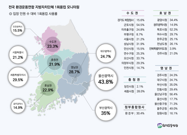 ȯ°æ´Üü°¡ ºÎ»ê µî Àü±¹ 31°³ ÁöÀÚü °ø°øÃ»»çÀÇ 1ȸ¿ëÄÅ »ç¿ë ½ÇŸ¦ Á¶»çÇß´õ´Ï, ºÎ»ê½Ãû»ç·Î µé¾î°¡´Â 1ȸ¿ëÄÅ Æò±Õ »ç¿ë·üÀÌ Àü±¹À» ¿ôµµ´Â °ÍÀ¸·Î ³ªÅ¸³µ´Ù.