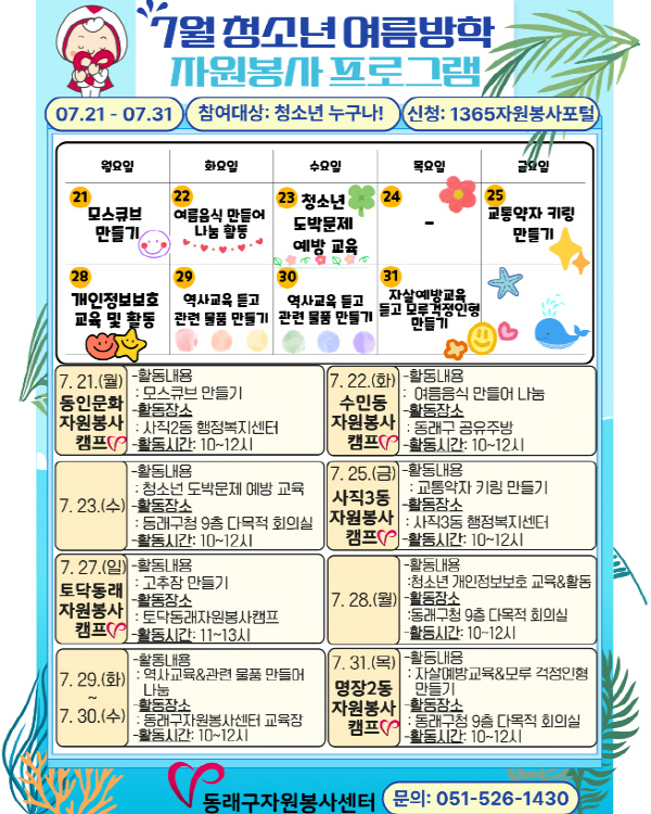 ºÎ»ê µ¿·¡±¸ÀÚ¿øºÀ»ç¼¾ÅÍ(¼¾ÅÍÀå Çϼҿ¬)´Â ¿À´Â 7¿ù 21ÀÏ(¿ù)ºÎÅÍ 7¿ù 31ÀÏ(¸ñ)±îÁö 11Àϰ£ ¿©¸§¹æÇÐÀ» ¸ÂÀº û¼Ò³âµéÀ» ´ë»óÀ¸·Î¡®2025³â ¿©¸§¹æÇРû¼Ò³â ÀÚ¿øºÀ»ç ÁýÁß ÇÁ·Î±×·¥(µ¿·¡ V-Æä½ºÅ¸)¡®¸¦ ¿î¿µÇÑ´Ù.