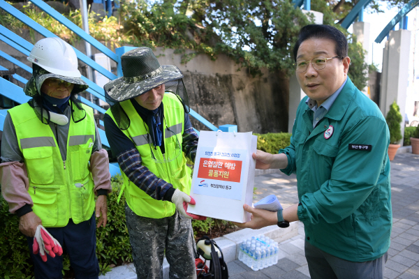 | ±èÁøÈ« µ¿±¸Ã»ÀåÀÌ ¹«´õÀ§ ¼Ó ½Ç¿Ü ±Ù¹« ±Ù·ÎÀڵ鿡°Ô ¿Â¿Áúȯ ¿¹¹æ ¹°Ç°À» Àü´ÞÇϰí ÀÖ´Ù. µ¿±¸ Á¦°ø
