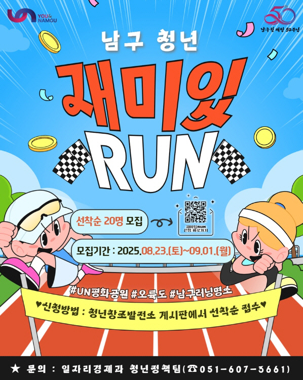 ºÎ»ê ³²±¸(±¸Ã»Àå ¿ÀÀºÅÃ)´Â û³âµéÀÇ °Ç° ÁõÁø°ú ±³·ù Ȱ¼ºÈ¸¦ À§ÇÑ ·¯´× ÇÁ·Î±×·¥ ¡¸³²±¸ û³â, Àç¹ÌÀÖRUN¡¹ 2±â Âü°¡ÀÚ¸¦ ¿À´Â 8¿ù 23ÀϺÎÅÍ 9¿ù 1ÀϱîÁö ¸ðÁýÇÑ´Ù°í ¹àÇû´Ù.