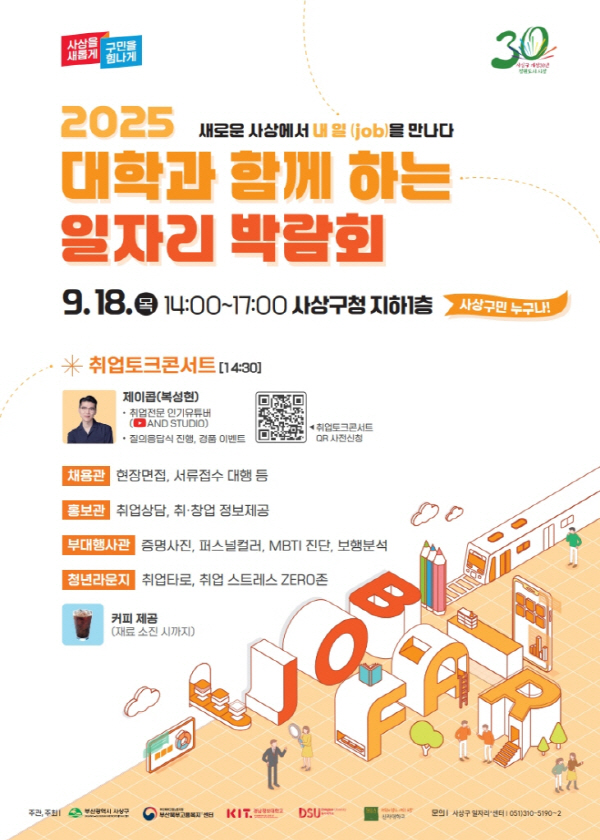 ºÎ»ê »ç»ó±¸(±¸Ã»Àå Á¶º´±æ)´Â û³â ¹× ±¸Á÷Àڵ鿡°Ô ´Ù¾çÇÑ °í¿ë Á¤º¸¸¦ Á¦°øÇϰí Áö¿ª ±â¾÷ÀÇ ÀÎÀç ä¿ëÀ» Áö¿øÇϱâ À§ÇØ ¡¸2025 ´ëÇаú ÇÔ²²ÇÏ´Â ÀÏÀÚ¸®¹Ú¶÷ȸ¡¹¸¦ ¿À´Â 9¿ù 18ÀÏ(¼ö) ¿ÀÈÄ 2½ÃºÎÅÍ 5½Ã±îÁö »ç»ó±¸Ã» ÁöÇÏ 1Ãþ¿¡¼ °³ÃÖÇÑ´Ù.