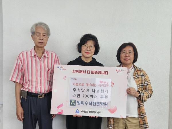 ºÎ»ê µ¿·¡±¸ »çÁ÷3µ¿ ÇàÁ¤º¹Áö¼¾ÅÍ(µ¿Àå ÀÌÇö¹Ì)´Â Áö³ 19ÀÏ ¾ËÆÄ¼öÇÐÀü¹®Çпø(´ëÇ¥ ±Ç¿ÀÁß)À¸·ÎºÎÅÍ Ãß¼®À» ¸Â¾Æ °ü³» Àú¼Òµæ ÀÌ¿ôµéÀ» À§ÇÑ ¶ó¸é 100¹Ú½º(130¸¸ ¿ø »ó´ç)¸¦ Àü´Þ¹Þ¾Ò´Ù°í ¹àÇû´Ù.