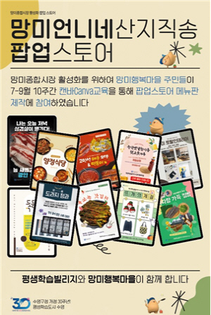 ¡®¸Á¹ÌÁ¾ÇÕ½ÃÀå ºê·£µù¡¯ »ç¾÷Àº ¸Á¹ÌÇູ¸¶À» ÁÖ¹ÎÇùÀÇü ȸ¿øµéÀÌ 10ÁÖ°£ ¡®µðÀÚÀΠĵ¹Ù±³½Ç¡¯ °Á¸¦ ¼ö·áÇÏ¿© ¼Õ¼ö ¸Þ´ºÆÇÀ» Á¦ÀÛ, ½ÃÀå ³» 10°³ ¾÷¼Ò »óÀε鿡°Ô Á÷Á¢ Àü´ÞÇÏ°í ¾÷¼Ò ³» »ó½Ã ¹èÄ¡ÇÏ¿© ¸Á¹ÌÁ¾ÇÕ½ÃÀå ÆË¾÷½ºÅä¾î Çà»ç(9.20ÀÏ °³ÃÖ) ½Ã ¹æ¹®°´ À¯ÀÔ°ú È«º¸¿¡ Ȱ¿ëÇϵµ·Ï ÇÑ »ç¾÷ÀÌ´Ù.