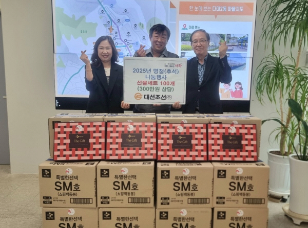 ºÎ»ê »çÇϱ¸ ´Ù´ë2µ¿ ¼ÒÀç ´ë¼±Á¶¼±¢ß (´ëÇ¥ ±Ç¹Îö)Àº 30ÀÏ ¹ÎÁ·ÃÖ´ë ¸íÀý Ãß¼®À» ¸Â¾Æ ¾î·Á¿î ÀÌ¿ôµéÀ» À§ÇØ »ýÇÊǰ ¼±¹°¼¼Æ® 100°³(¾à 300¸¸ ¿ø »ó´ç)¸¦ ´Ù´ë2µ¿ ÇàÁ¤º¹Áö¼¾ÅÍ¿¡ Àü´ÞÇß´Ù.