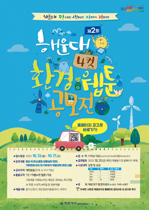 À̹ø °ø¸ðÀüÀº Àü±¹ ´©±¸³ª Âü¿©ÇÒ ¼ö ÀÖÀ¸¸ç, Àü¹®°¡ ½É»ç¸¦ ÅëÇØ ÃÑ 14Á¡ÀÇ ¿ì¼öÀÛÀ» ¼±Á¤ÇÑ´Ù. ¼ö»óÀÚ¿¡°Ô´Â ÃÖ°í 30¸¸ ¿øÀÇ »ó±Ý°ú »óÀåÀÌ ¼ö¿©µÇ¸ç, ÀÔ»óÀÛÀº ¡®Åº¼ÒÁ߸³ ÇØ¿î´ë ÀνºÅ¸±×·¥(haeundae_netzero)¡¯µî¿¡ °Ô½ÃµÅ È«º¸¿¡ Ȱ¿ëµÉ ¿¹Á¤ÀÌ´Ù.