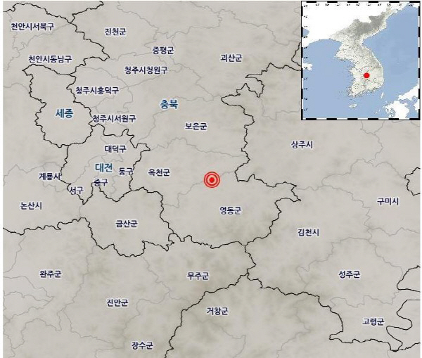 Ãß¼® ¿¬ÈÞÀÎ 8ÀÏ ¿ÀÀü 11½Ã 49ºÐ 39ÃÊ ÃæºÏ ¿Áõ±º µ¿ÂÊ 17§° Áö¿ª¿¡¼ ±Ô¸ð 3.1ÀÇ ÁöÁøÀÌ ¹ß»ýÇß´Ù. ÁöÁø Áø¾ÓÀº ºÏÀ§ 36.28µµ, µ¿°æ 127.76µµÀ̸ç, ¹ß»ý ±íÀÌ´Â 9§°·Î °üÃøµÆ´Ù.