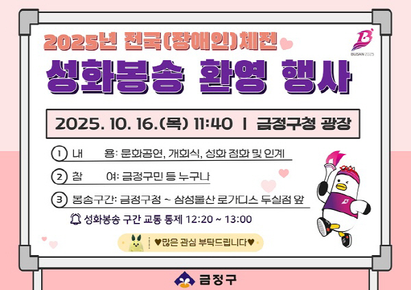 ºÎ»ê½Ã ±ÝÁ¤±¸(±¸Ã»Àå À±ÀÏÇö)´Â ¿À´Â 10¿ù 16ÀÏ Á¦106ȸ Àü±¹Ã¼À°´ëȸ ¹× Á¦45ȸ Àü±¹Àå¾ÖÀÎüÀ°´ëȸÀÇ ¼º°øÀûÀÎ °³ÃÖ¸¦ À§ÇÑ ¼ºÈºÀ¼Û ȯ¿µ Çà»ç¸¦ °³ÃÖÇÑ´Ù°í ¹àÇû´Ù.