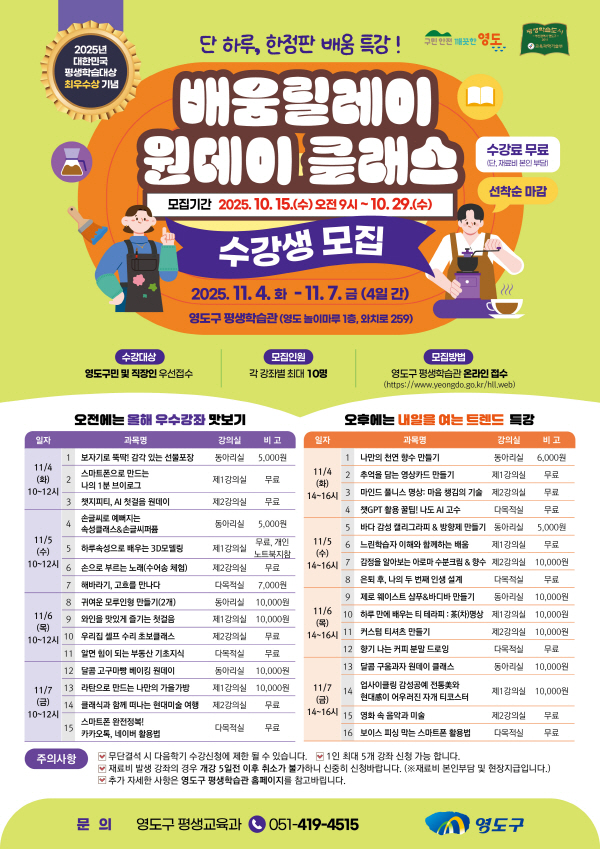 ºÎ»ê ¿µµµ±¸(±¸Ã»Àå ±è±âÀç)´Â ¡®´ëÇѹα¹ Æò»ýÇнÀ´ë»ó ÃÖ¿ì¼ö»ó¡¯ ¼ö»óÀ» ±â³äÇÏ¿© ¿À´Â 11¿ù 4ÀÏ(È)ºÎÅÍ 7ÀÏ(±Ý)±îÁö 4Àϰ£ ¿µµµ±¸ Æò»ýÇнÀ°ü(¿ÍÄ¡·Î 259)¿¡¼ ¡®2025 ¿µµµ±¸ ¹è¿ò¸±·¹ÀÌ ¿øµ¥ÀÌ Å¬·¡½º¡¯¸¦ ¿î¿µÇϸç, ÇöÀç ¼ö°»ýÀ» ¸ðÁý ÁßÀ̶ó°í ¹àÇû´Ù.