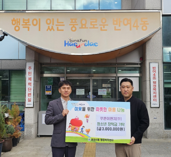 Ǫ¸¥À̾ØÁö(ÁÖ)(´ëÇ¥ °º´ÁÖ)´Â Áö³ 24ÀÏ(±Ý) ÇØ¿î´ë±¸ ¹Ý¿©4µ¿ ÇàÁ¤º¹Áö¼¾ÅÍ(µ¿Àå ±è±âȯ)¿¡ ÀåÇÐ±Ý 3¹é¸¸¿øÀ» ±âŹÇß´Ù.