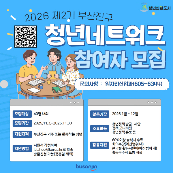¸ðÁý ´ë»óÀº ¸¸ 18¼¼ ÀÌ»ó 39¼¼ ÀÌÇÏÀÇ Ã»³âÀ¸·Î ºÎ»êÁø±¸¿¡ °ÅÁÖÇϰųª ºÎ»êÁø±¸ ³» Çб³¡¤Á÷À塤´Üü¿¡¼ Ȱµ¿ ÁßÀÌ¸é ´©±¸³ª Áö¿øÇÒ ¼ö ÀÖ´Ù. ÃÑ 40¸í ³»¿ÜÀÇ È°µ¿À§¿øÀ» ¼±¹ßÇØ 2026³â ÇÑ ÇØ µ¿¾È û³âÁ¤Ã¥ ¹ß±¼ ¹× Á¦¾È, Á¤Ã¥ ¸ð´ÏÅ͸µ, û³âÁ¤Ã¥ È«º¸ µî û³âÀÌ ÁÖü°¡ µÇ´Â ´Ù¾çÇÑ È°µ¿À» ÆîÄ¡°Ô µÈ´Ù.