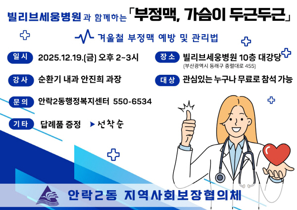 ºÎ»ê µ¿·¡±¸ ¾È¶ô2µ¿ ÇàÁ¤º¹Áö¼¾ÅÍ(µ¿Àå ±è¼ö¿¬)¿Í Áö¿ª»çȸº¸ÀåÇùÀÇü(À§¿øÀå ¾È¿ìȯ)´Â ¿À´Â 12¿ù 19ÀÏ ¿ÀÈÄ 2½Ã ºô¸®ºê¼¼¿õº´¿ø(º´¿øÀå ¹èÀÍÇö) 10Ãþ ´ë°´çȦ¿¡¼ °Ü¿ïö ±â¿Â ÇϰÀ¸·Î ÀÎÇÑ Ç÷¾Ð »ó½Â ¹× ºÎÁ¤¸Æ µî ½ÉÀåÁúȯ À§Çè¿¡ ´ëºñÇϰíÀÚ ºô¸®ºê¼¼¿õº´¿ø ¼øÈ¯±â³»°ú Àü¹®ÀǸ¦ ÃÊûÇÑ °Ç° °Á¡®ºÎÁ¤¸Æ, °¡½¿ÀÌ µÎ±ÙµÎ±Ù¡¯À» ¹«·á·Î °³ÃÖÇÑ´Ù°í ¹àÇû´Ù.