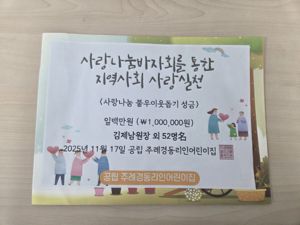 À̹ø ±âʱÝÀº Áö³ 17ÀÏ ¾î¸°ÀÌÁý ÇкθðµéÀÌ °¡Á¤¿¡¼ »ç¿ëÇÏÁö ¾Ê´Â ¹°Ç°À» ³ª´®¡¤ÆÇ¸ÅÇÏ´Â ¡®»ç¶û³ª´®¹ÙÀÚȸ¡¯ ¿î¿µ ¼öÀͱÝÀ¸·Î Áö¿ª ³» ¾î·Á¿î ÀÌ¿ôÀ» µ½±â À§ÇØ ¼ÒÁßÇÑ ¶æÀ» ¸ð¾Æ Àü´ÞÇÑ °ÍÀÌ´Ù.