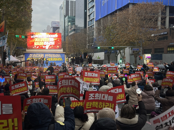 Áýȸ¿¡ Âü°¡ÇÑ ¾à 700¸íÀº Á¶Èñ´ë ´ë¹ý¿øÀå źÇÙ, ³»¶õƯº°ÀçÆÇºÎ ¼³Ä¡, ±¹¹ÎÀÇÈû ÇØÃ¼¸¦ ¿ÜÄ¡¸ç ÁöÇÏö 2È£¼± °³²¿ª ¹æÇâÀ¸·Î ÇàÁøÇß´Ù. ÀϺΠÂü°¡ÀÚ°¡ À± Àü ´ëÅë·É°ú ±è°ÇÈñ ¿©»ç°¡ Á˼öº¹À» ÀÔÀº ¸ð½ÀÀ» ´ãÀº Çö¼ö¸·À» ¹â°Å³ª ¼ÕÀ¸·Î ³»·ÁÄ¡´Â ¸ð½Àµµ Æ÷ÂøµÆ´Ù.