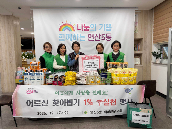 ¿¬Á¦±¸ ¿¬»ê5µ¿ »õ¸¶À»¹®°íȸ(ȸÀå ¹ÚÁ¤È)´Â 12¿ù 17ÀÏ ¼ö¿äÀÏ ¡®¾î¸£½Å ã¾ÆºË±â, 1% È¿ ½Çõ Çà»ç¡¯¸¦ ½Ç½ÃÇÏ¿© »ç¶ûÀÇ »ýÇÊǰ(¾à 40¸¸¿ø »ó´ç)À» ±âŹÇÏ°í ±× Áß ÀϺθ¦ Á÷Á¢ Àü´ÞÇÏ¿´´Ù.
