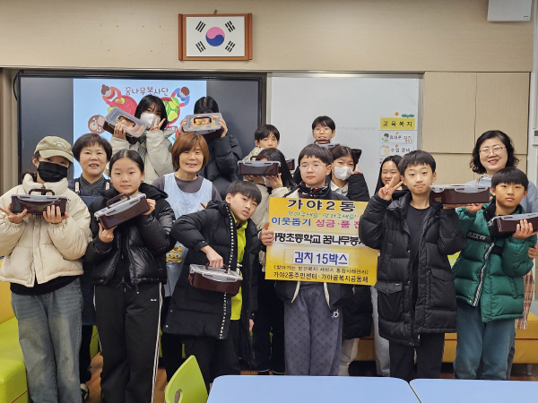°¡ÆòÃʵîÇб³(±³Àå ½Åº´°Ç)ÀÇ Çлý ºÀ»ç´ÜÀÎ ²Þ³ª¹«ºÀ»ç´ÜÀÌ 29ÀÏ °¡¾ß2µ¿(µ¿Àå ±è¿µ¹Ì)¿¡ ¾î·Á¿î ÀÌ¿ôÀ» À§ÇÑ ±èÄ¡ 5kg 15¹Ú½º¸¦ ±âŹÇß´Ù. À̹ø ³ª´®Àº ¿¬¸»À» ¸Â¾Æ Áö¿ª»çȸ¿¡ µû¶æÇÑ Á¤À» ³ª´©±â À§ÇØ ¸¶·ÃµÈ °ÍÀÌ´Ù. °¡ÆòÃʵîÇлýµéÀº ¾ç³ä ¹ö¹«¸®±â, Æ÷Àå±îÁö Àü °úÁ¤¿¡ Àû±ØÀûÀ¸·Î Âü¿©Çß´Ù.