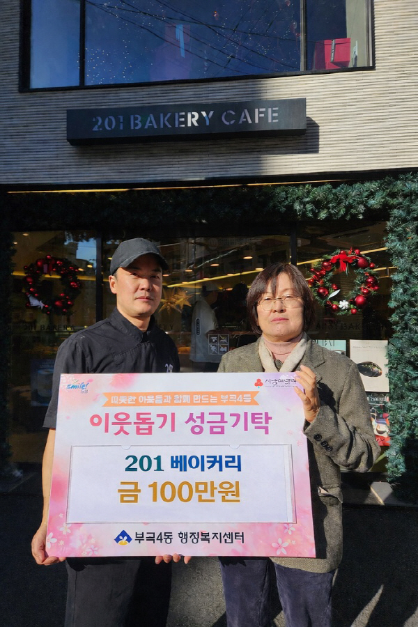 ºÎ»ê½Ã ±ÝÁ¤±¸ ºÎ°î4µ¿ ÇàÁ¤º¹Áö¼¾ÅÍ´Â 201 º£ÀÌÄ¿¸®(´ëÇ¥: ÀÌ¿µÀÏ)¿¡¼ Áö³ 26ÀÏ ÀÌ¿ôµ½±â ¼º±Ý 100¸¸ ¿øÀ» ±âŹÇß´Ù°í ¹àÇû´Ù.