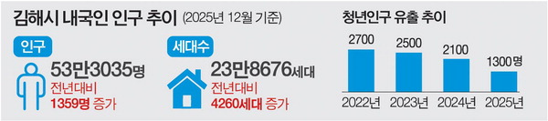 5ÀÏ ÇàÁ¤¾ÈÀüºÎ Áֹεî·Ï Àα¸Åë°è¿¡ µû¸£¸é 2025³â 12¿ù ±âÁØ ±èÇØ½Ã ³»±¹ÀÎ Àα¸´Â 53¸¸3035¸íÀ¸·Î Àü³â ´ëºñ 1359¸íÀÌ Áõ°¡Çß´Ù. ¼¼´ë¼öµµ Àü³â ´ëºñ 4260¼¼´ë°¡ ´Ã¾î³ 23¸¸8676¼¼´ë¸¦ ±â·ÏÇß´Ù. ±èÇØ ¿¬°£ Àα¸¼ö°¡ Áõ°¡ÇÑ °ÍÀº 2019³â ÀÌÈÄ 6³â ¸¸ÀÌ´Ù.