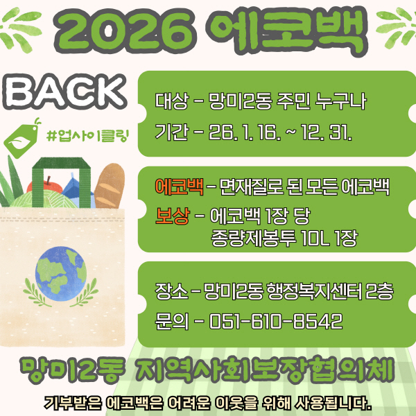 ºÎ»ê±¤¿ª½Ã ¼ö¿µ±¸ ¸Á¹Ì2µ¿ ÇàÁ¤º¹Áö¼¾ÅÍ(µ¿Àå ÀÌÀºÈñ)´Â ¿À´Â 16ÀϺÎÅÍ ¸Á¹Ì2µ¿ Áö¿ª»çȸº¸ÀåÇùÀÇü(À§¿øÀå ÃÖÇâ¼÷) ÁÖ°üÀ¸·Î ¿¡ÄÚ¹é Àç»ç¿ëÀ» ÅëÇÑ Ä£È¯°æÀû º¹Áö¹®È Á¶¼º »ç¾÷À» ÃßÁøÇÑ´Ù°í ¹àÇû´Ù.