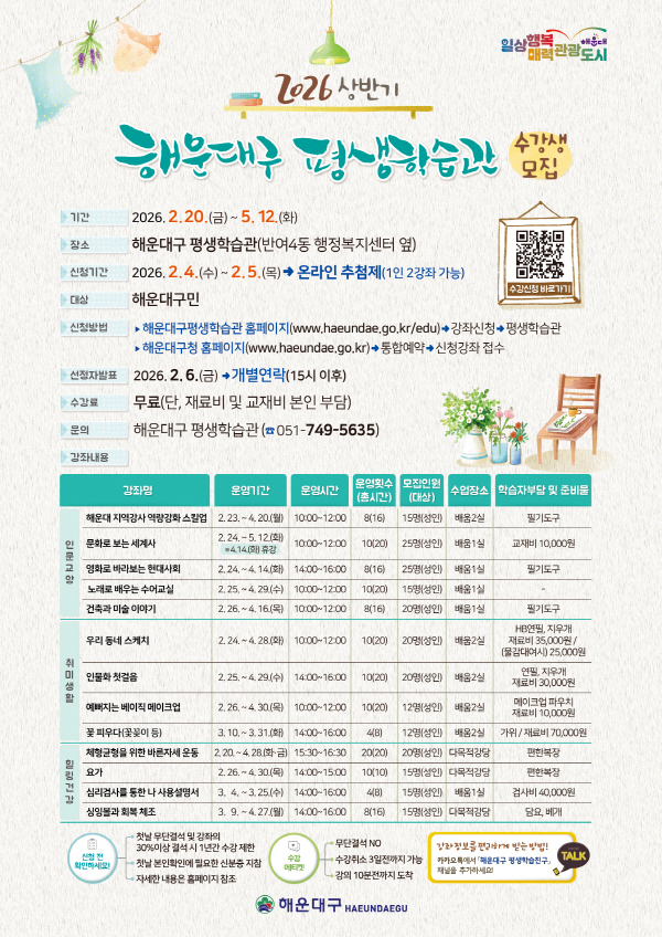 ÇØ¿î´ë±¸(±¸Ã»Àå ±è¼º¼ö)´Â Áö¿ª ÁÖ¹ÎÀÇ Æò»ýÇнÀ Âü¿© È®´ë¸¦ À§ÇØ 2026³â Æò»ýÇнÀ°ü »ó¹Ý±â ÇÁ·Î±×·¥ ¼ö°»ýÀ» ¸ðÁýÇÑ´Ù.