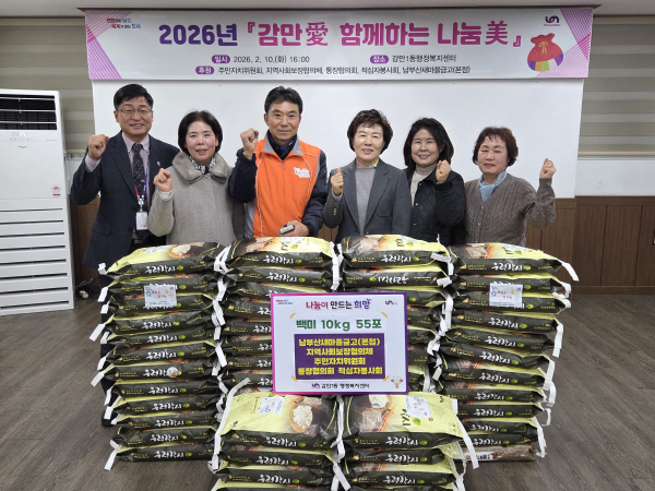 À̹ø ³ª´® Çà»ç¿¡¼´Â ³²ºÎ»ê»õ¸¶À»±Ý°í(ÀÌ»çÀå ¹Ú°æ¿±), Áö¿ª»çȸº¸ÀåÇùÀÇü(À§¿øÀå ±èµµÀ±), ÁÖ¹ÎÀÚÄ¡À§¿øÈ¸(À§¿øÀå ±è¿¬¼ø), ÅëÀåÇùÀÇȸ(ȸÀå °¼±ÀÚ), Àû½ÊÀÚºÀ»çȸ(ȸÀå Á¶Á¤Èñ)°¡ ½Ê½ÃÀÏ¹Ý ¸¶À½À» ¸ð¾Æ ¸¶·ÃÇÑ ½Ò10kg 55Æ÷¸¦ µû¶æÇÑ ¸íÀý º¸³»½Ã¶ó´Â Àλç¿Í ÇÔ²² °ü³» Àú¼ÒµæÃþ ¹× Ȧ·Î¾î¸£½Å¿¡°Ô Àü´ÞÇß´Ù.