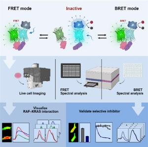 ¿¬±¸ÆÀÀº À̹ø ¿¬±¸¿¡¼ Çü±¤ ±â¹ÝÀÇ FRET(F?rster resonance energy transfer)¿Í ¹ß±¤ ±â¹ÝÀÇ BRET(bioluminescence resonance energy transfer)¸¦ ÇϳªÀÇ Ç÷§ÆûÀ¸·Î ÅëÇÕÇÑ ¹ÙÀÌ¿À¼¾¼¸¦ °³¹ßÇß´Ù. À̸¦ ÅëÇØ KRAS¿Í RAF ´Ü¹éÁú °£ °áÇÕ°ú ÇØ¸®¸¦ ½Ã°£ Ãà¿¡¼ Á¤·®ÀûÀ¸·Î ÃßÀûÇÏ´Â µ¥ ¼º°øÇß´Ù.