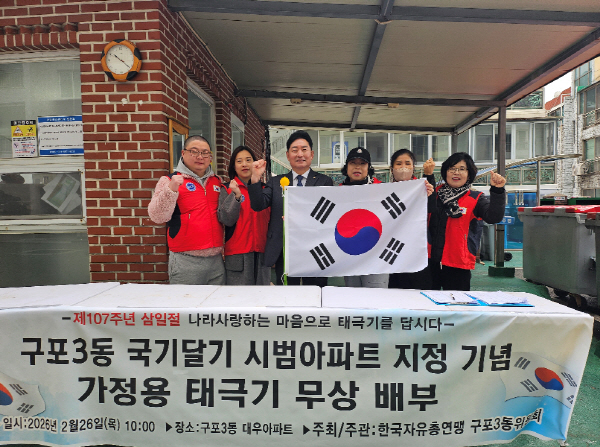 À̳¯ Çѱ¹ÀÚÀ¯ÃÑ¿¬¸Í ±¸Æ÷3µ¿À§¿øÈ¸ ȸ¿ø 10¿© ¸íÀº ¿ÃÇØ ±¹±â´Þ±â ½Ã¹ü±¸¿ªÀ¸·Î ÁöÁ¤µÈ ±¸Æ÷´ë¿ì¾ÆÆÄÆ® ¾Õ¿¡¼ ÁֹεéÀ» ´ë»óÀ¸·Î °¡Á¤¿ë űرâ 100±â¸¦ ¼±Âø¼øÀ¸·Î ¹«»ó ¹èºÎÇÏ¸ç ±¹°æÀÏ Å±ر⠰ԾçÀ» Àû±Ø µ¶·ÁÇß´Ù. ¶ÇÇÑ ¿Ã¹Ù¸¥ ±¹±â °Ô¾ç ¹æ¹ýÀ» ¾È³»ÇÏ´Â µî ÅÂ±Ø±â °Ô¾ç ¹®È È®»ê¿¡ Èû½è´Ù.