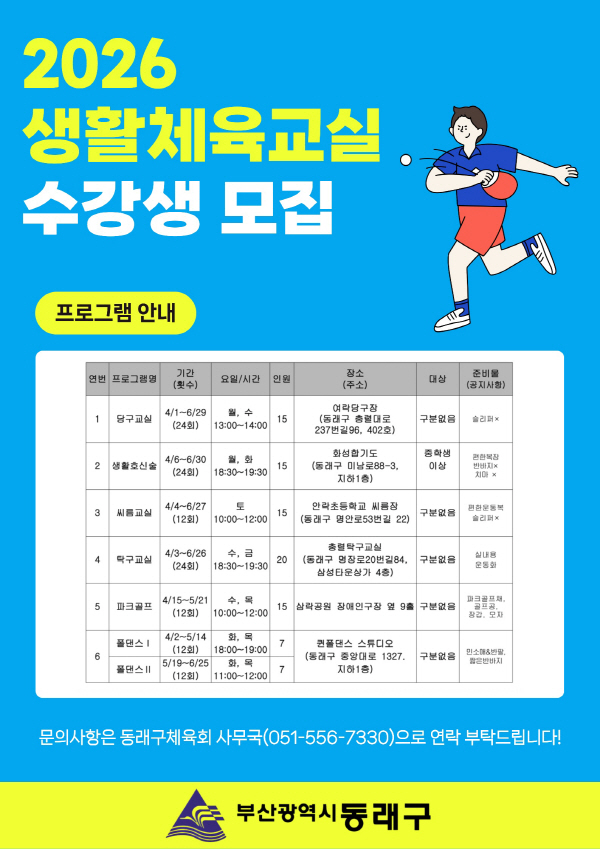 ºÎ»ê µ¿·¡±¸(±¸Ã»Àå ÀåÁØ¿ë)´Â Áö¿ª ÁÖ¹ÎÀÇ »ýȰüÀ° Âü¿© È®´ë¿Í °Ç°ÇÑ ¿©°¡ Ȱµ¿ Áö¿øÀ» À§ÇØ ¡®2026³â »ó¹Ý±â »ýȰüÀ°±³½Ç¡¯ ¼ö°»ýÀ» ¸ðÁýÇÑ´Ù°í ¹àÇû´Ù.