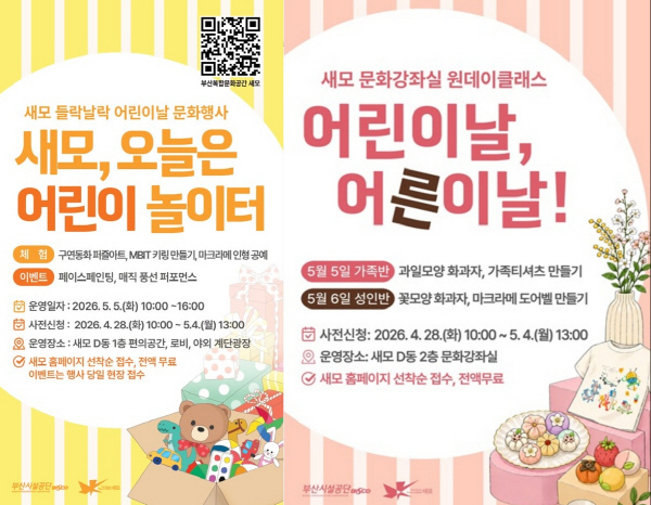 ºÎ»ê½Ã¼³°ø´Ü(ÀÌ»çÀå À̼º¸²)Àº ¿À´Â 5¿ù 5ÀÏ »õ¸ð¿¡¼ ¾î¸°À̳¯ Ưº° ÇÁ·Î±×·¥ ¡¸»õ¸ð, ¿À´ÃÀº ¾î¸°ÀÌ ³îÀÌÅÍ¡¹¸¦ ¿î¿µÇϰí, °¡Á· ´ÜÀ§ ½Ã¹ÎµéÀÌ ÇÔ²² Âü¿©ÇÒ ¼ö ÀÖ´Â ´Ùä·Î¿î üÇè ÇÁ·Î±×·¥À» ¼±º¸ÀÎ´Ù°í ¹àÇû´Ù.