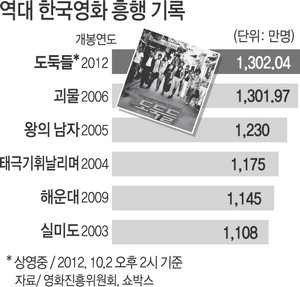 'µµµÏµé'ÀÇ ´©Àû°ü°´ ¼ö´Â °³ºÀ 70ÀÏ ¸¸ÀÇ ´Ü±â°£¿¡ ÀÛ¼ºµÆ´Ù´Â Á¡¿¡¼ °æÀÌ·Ó´Ù. 6³â Àü '±«¹°'Àº 106ÀÏ ¸¸¿¡ 1300¸¸ ¸íÀ» µ¹ÆÄÇß´Ù. Áö³ 7¿ù 25ÀÏ °³ºÀÇÑ 'µµµÏµé'Àº ºÒ°ú 10ÀÏ ¸¸¿¡ 500¸¸À» ³Ñ¾î¼± µ¥ À̾î 22ÀÏ ¸¸¿¡ 1000¸¸ °ü°´ °íÁö¿¡ ¿À¸£¸ç Æø¹ßÀûÀÎ ÈïÇà·ÂÀ» °ú½ÃÇß´Ù.