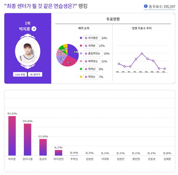¹ÚÁöÈÆÀº ÃÑ 195,197Ç¥ Áß 81,281Ç¥(41.6%)¸¦ ȹµæÇϸç 1À§¸¦ Â÷ÁöÇß´Ù. 'À®Å©'·Î ±¹¹Î ÇÁ·Îµà¼µéÀÇ ¸¶À½À» ²Ë ÀâÀ¸¸ç ù ¼øÀ§ ¹ßÇ¥½Ä¿¡¼ 1À§¸¦ Â÷ÁöÇÑ ¹ÚÁöÈÆÀº ±Í¿©¿î ¿Ü¸ð¿Í ¼º½ÇÇÑ ÀÚ¼¼·Î Å« »ç¶ûÀ» ¹ÞÀ¸¸ç ²ÙÁØÇÑ Àα⸦ ¾ò°í ÀÖ´Ù. ÀÌ¿¡ ÇÁµà2 Âü°¡ÀÚ¿Í ½ÃûÀÚµé ¸ðµÎ ÇѸñ¼Ò¸®·Î ¹ÚÁöÈÆÀ» °¡Àå °·ÂÇÑ 1À§ Èĺ¸ ¿¬½À»ýÀ¸·Î ²Å°í ÀÖ´Ù.