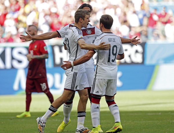 17ÀÏ(Çѱ¹ ½Ã°¢) 2014ºê¶óÁú ¿ùµåÄÅ µ¶Àϰú Æ÷¸£Åõ°¥°úÀÇ GÁ¶ Á¶º°¸®±×¿¡¼ µ¶ÀÏÀÇ Å丶½º ¹Á·¯(¿ÞÂÊ)°¡ ù°ñÀ» ÅͶ߸°ÈÄ µ¿·áµé°ú ±â»µÇϰí ÀÖ´Ù. AP=¿¬ÇÕ´º½º.