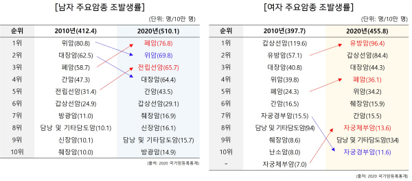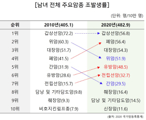 ±×¿¡ µû¸£¸é À§¾Ï ¹ß»ýÀº 2À§¿¡¼ 4À§·Î, °£¾ÏÀº 5À§¿¡¼ 7À§·Î ³»·Á¾É¾Ò´Ù. ¹Ý¸é Æó¾ÏÀº 4À§¿¡¼ 2À§·Î, À¯¹æ¾ÏÀº 6À§¿¡¼ 5À§·Î, Àü¸³¼±¾ÏÀº 7À§¿¡¼ 6À§·Î °¢°¢ ¿Ã¶ú´Ù. ƯÈ÷ Àü¸³¼±¾ÏÀº 109%, À¯¹æ¾ÏÀº 112%, ÀÚ±ÃüºÎ¾ÏÀº 85%ÀÇ ³ôÀº Áõ°¡À²À» ³ªÅ¸³Â´Ù.