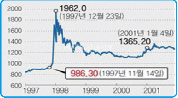 ´ëÇ¥ÀûÀÎ ¿¹°¡ 1997³â ¿ÜȯÀ§±â ¶§´Ù. 1997³â 12¿ù ¿ø/´Þ·¯ ȯÀ²ÀÌ 1962¿ø±îÁö ±ÞµîÇϱ⵵ ÇÑ ÀÌÈÄ È¯À²Àº Áö¼ÓÀûÀ¸·Î Ç϶ôÇÏ¿© 2007³â 10¿ù ¸»¿¡´Â 901¿ø¿¡ À̸£±âµµ Çß´Ù. ´ç½Ã Çѱ¹ÁֽĿ¡ ÅõÀÚÇÑ ¿Ü±¹ÀÎÀº ½Ã¼¼Â÷ÀÍ»Ó ¾Æ´Ï¶ó ¾öû³ ȯÂ÷À͵µ °ÅµÎ¾ú´Ù. ÀϹÝÀûÀ¸·Î ¿Ü±¹ÀεéÀÌ Çѱ¹ÁÖ½ÄÀ» ¸Å¼öÇÏ°Ô µÇ¸é ȯÀ²ÀÌ ¶³¾îÁö°Ô µÈ´Ù. ÀÌ´Â Çѱ¹ÁÖ½ÄÀ» ¸Å¼öÇϱâ À§Çؼ´Â ´Þ·¯¸¦ ¿øÈ·Î ȯÀüÇØ¾ß Çϱ⠶§¹®ÀÌ´Ù. ´ç¿¬È÷ ¼¿ï ¿Üȯ½ÃÀå¿¡¼´Â ´Þ·¯°ø±ÞÀÌ ´Ã¾î³ª ´Þ·¯°¡Ä¡´Â Ç϶ôÇϰí, »ó´ëÀûÀ¸·Î ¿øÈ°¡Ä¡´Â »ó½ÂÇÏ´Â ¿òÁ÷ÀÓÀ» º¸ÀÌ°Ô µÈ´Ù.