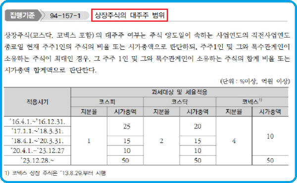 Áö³­ 7¿ù Á¤ºÎ°¡ ´ëÁÖÁÖ ±âÁØÀ» ½Ã°¡ÃÑ¾× 10¾ï ¿øÀ¸·Î ³·Ãá´Ù°í Çϸ鼭 ½ÃÀåÀÌ Å©°Ô Èçµé¸®±âµµ ÇßÁö¸¸ Á¤Ä¡±Ç°ú ÅõÀÚÀÚµéÀÇ ¹Ý¹ß, ±×¸®°í ´ëÅë·ÉÀÇ ¹ß¾ð±îÁö À̾îÁø ³íÀÇ ²ø¿¡ ÃÖÁ¾ÀûÀ¸·Î ÇöÇà ½Ã°¡ÃÑ¾× ¿ä°ÇÀÎ 50¾ï ¿øÀ¸·Î À¯ÁöµÇ±â·Î Çß´Ù. ±¹³» »óÀåÁÖ½ÄÀÏ °æ¿ì ¾çµµ¼Òµæ¼¼°¡ Áß¼Ò±â¾÷ÀÎÁö Áß¼Ò±â¾÷ ÀÌ¿ÜÀÎÁö¿¡ µû¶ó ¼¼À²ÀÌ ´Þ¸® Àû¿ëµÈ´Ù. ¿©±â´Ù ¼Ò¾×ÁÖÁÖ¿Í´Â ´Þ¸® ´ëÁÖÁÖÀÇ °æ¿ì¿¡´Â 1³â ÀÌ»ó°ú 1³â ¹Ì¸¸ º¸À¯¸¦ ±¸ºÐÇØ ¾çµµ¼Òµæ¼¼¸¦ ºÎ°úÇÑ´Ù.