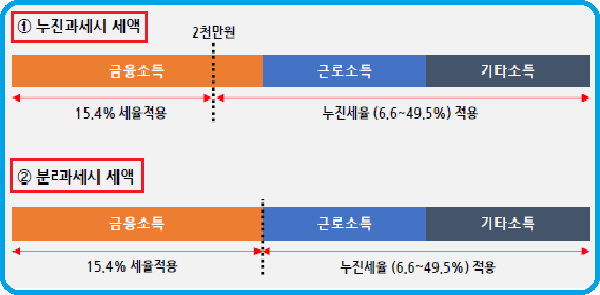 ÇöÀç ¿ì¸®³ª¶ó ±ÝÀ¶¼Òµæ °ú¼¼´Â Å©°Ô µÎ °¡Áö·Î ³ª´­ ¼ö ÀÖ´Ù. ¿ì¼± ¡®ºÐ¸®°ú¼¼¡¯ µÇ´Â ¿øÃµÂ¡¼ö¸¦ µé ¼ö ÀÖ´Ù. ±ÝÀ¶¼ÒµæÀÌ ¿¬°£ 2000¸¸ ¿ø ÀÌÇÏÀÏ °æ¿ì·Î ÀϹÝÀûÀ¸·Î Áö¹æ¼Òµæ¼¼ Æ÷ÇÔ 15.4%·Î ¿øÃµÂ¡¼ö µÊÀ¸·Î ³³¼¼Àǹ«°¡ Á¾°áµÈ´Ù. ´Ù¸¥ Çϳª´Â ¡®±ÝÀ¶¼Òµæ Á¾ÇÕ°ú¼¼¡¯´Ù. ÀÌ´Â ÀÌÀÚ¼Òµæ°ú ¹è´ç¼ÒµæÀÇ ÇÕ°è¾×ÀÌ ¿¬°£ 2000¸¸ ¿øÀ» ÃʰúÇÏ°Ô µÇ¸é ±× ÃʰúºÐÀ» ´Ù¸¥ ¼ÒµæÀÎ ±Ù·Î¼Òµæ, »ç¾÷¼Òµæ ¿¬±Ý¼Òµæ ±âŸ¼Òµæ µî°ú ÇÕ»êÇÏ¿© °íÀ²ÀÇ ´©Áø¼¼À²À» Àû¿ëÇØ °ú¼¼ÇÏ´Â ¹æ½ÄÀÌ´Ù.