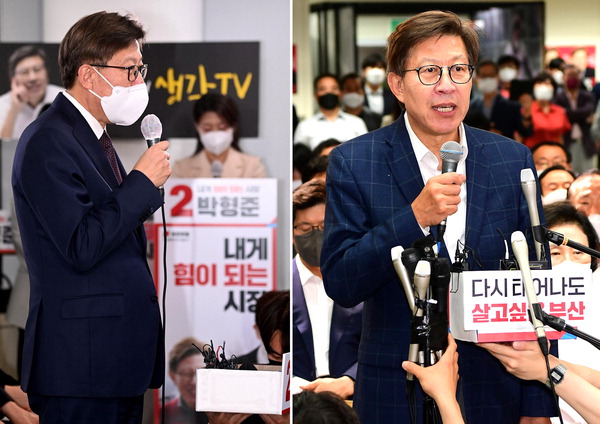 | ¹ÚÇüÁØ ºÎ»ê½ÃÀåÀÌ 2021³â ºÎ»ê½ÃÀå º¸±È¼±°Å¿Í 2022³â ºÎ»ê½ÃÀå ¼±°Å¿¡¼ °¢°¢ ´ç¼±µÈ µÚ ¼±°ÅÄ·ÇÁ¿¡¼ Àλ縻À» ÇÏ´Â ¸ð½À. ¹Ú ½ÃÀåÀº 2021³â¿¡´Â '³»°Ô ÈûÀÌ µÇ´Â ½ÃÀå'À», 2022³â¿¡´Â '´Ù½Ã žµµ »ì°í ½ÍÀº ºÎ»ê'À» ¼±°Å ½½·Î°ÇÀ¸·Î ³»°É¾ú´Ù. ±¹Á¦½Å¹® DB |