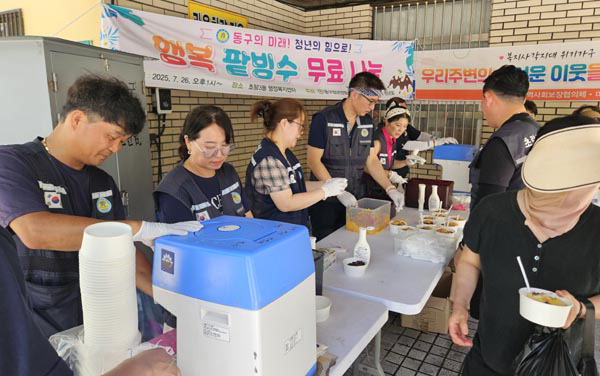 ºÎ»ê µ¿±¸ ÃÊ·®3µ¿ û³âȸ(ȸÀå ±è¼º´ë)´Â °è¼ÓµÇ´Â Æø¿°À¸·Î ´õÀ§¿¡ ÁöÄ£ ÁֹεéÀ» À§ÇÏ¿© Áö³ 26ÀÏ ÃÊ·®3µ¿ ÇàÁ¤º¹Áö¼¾ÅÍ ÁÖÂ÷Àå¿¡¼ ¡®ÇູÆÏºù¼ö ³ª´® Çà»ç¡¯¸¦ °³ÃÖÇß´Ù. ÀÌ Çà»ç´Â µ¿±¸Ã»³â¿¬ÇÕȸ ÇູÆÏºù¼ö ¹ß´ë½Ä¿¡ ÀÌ¾î °¢ µ¿¿¡¼ ¸±·¹ÀÌ Çü½ÄÀ¸·Î ÀÌ·ç¾îÁö°í ÀÖ´Ù.